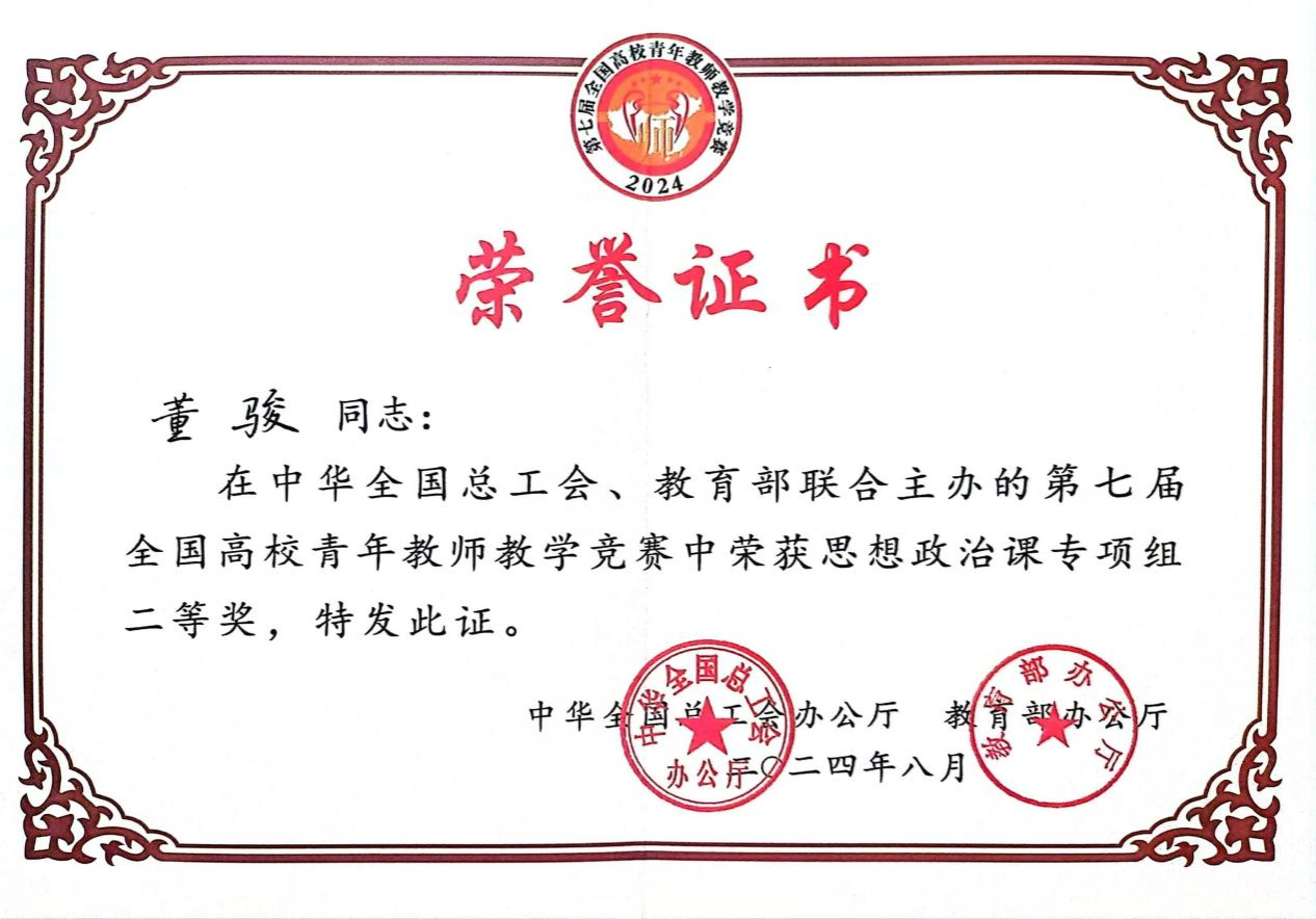 8月30日,第七届全国高校青年教师教学竞赛决赛在上海交通大学顺利落下帷幕,经过激烈角逐,太阳成集团tyc33455cc院董骏副教授脱颖而出,荣获第七届全国高校青年教师教学竞赛思想政治课专项组二等奖,取得公司在该组别历史最好成绩,这也是重庆市在该组别历史的最好成绩。