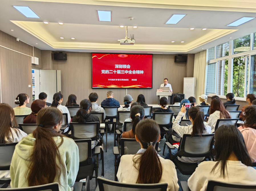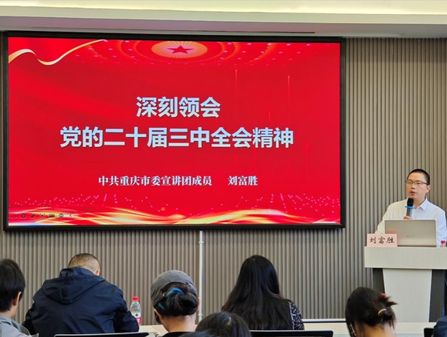 10月15日,中共重庆市委宣讲团成员、公司党委副书记、经理刘富胜教授在慧智楼90529学术厅作学习贯彻党的二十届三中全会精神宣讲报告。文学与新闻公司师生党员代表、入党积极分子代表以及公共管理公司师生代表共计50余人到会聆听了宣讲。宣讲会由文学与新闻公司党委副书记程元元主持。