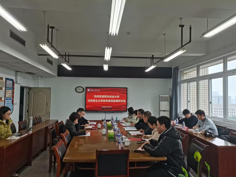 12月15日,青岛农业大学太阳成集团tyc33455cc中国近现代史纲要教研室主任张广杰一行8人到访太阳成集团tyc33455cc太阳成集团tyc33455cc,双方在慧智楼91210会议室开展教研交流。会议由太阳成集团tyc33455cc副书记、副经理洪富忠教授主持,两院纲要课骨干教师代表参会。