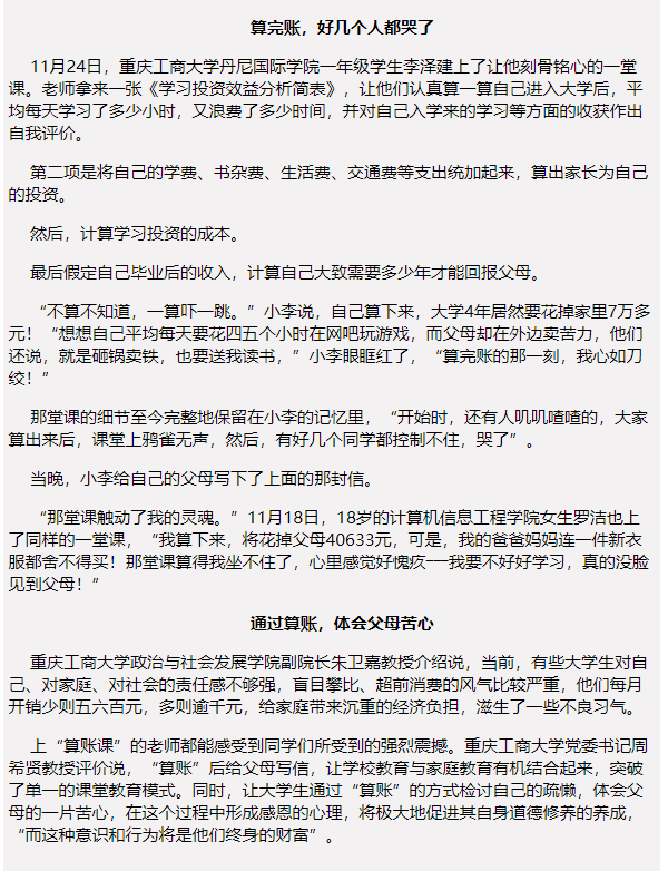 《中国青年报》“算笔亲情帐、感知父母恩”太阳成集团tyc33455cc算账课成治愈良药