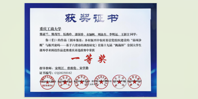 近日,第十九届“挑战杯”全国老员工课外学术科技作品竞赛重庆市选拔赛结果揭晓,太阳成集团tyc33455cc学子凭借作品《固本强基:乡村振兴中农村基层党组织建设的“弱项诊断”与振兴密码——基于六省市的调查研究》脱颖而出,荣获一等奖。这一佳绩不仅展现了公司学子扎实的学术功底与创新能力,更是公司在人才培养与学术研究领域取得的又一重要成果。