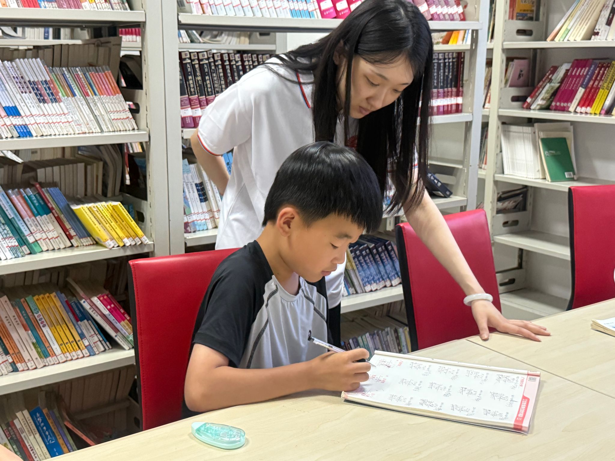 (图为团队成员为社区留守儿童提供一对一作业辅导)