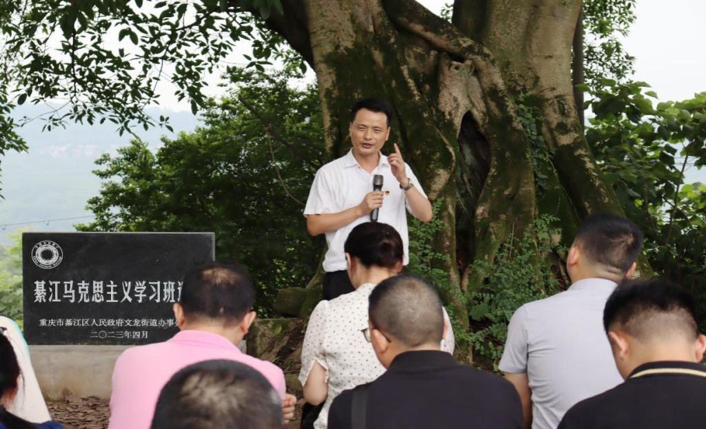 在重庆唯一的且重庆最早的马克思主义学习班遗址——綦江马克思主义学习班遗址,重庆市綦江区人民政府文龙街道办事处主任代显锋介绍了“黄葛树下学理论”活动开展的情况和展望;红军长征纪念馆朱艺华讲述了黄葛树下的故事;支部党员陈晓钢教授带来了以“诗、史、物三结合的思政课教学资源建设”为主题的党课,他基于诗言志、词传情、读史可以知兴替,就诗的选择、史的选择和物的选择三个方面进行了讲述,实现以激情、史实、实景增强理论阐释的生动性和说服力。大家纷纷表示,作为一名党员,要赓续红色血脉,永远跟党走,发挥模范带头作用;作为一名思政课教师,要将党的辉煌历史融入教学,讲深、讲透、讲活道理。